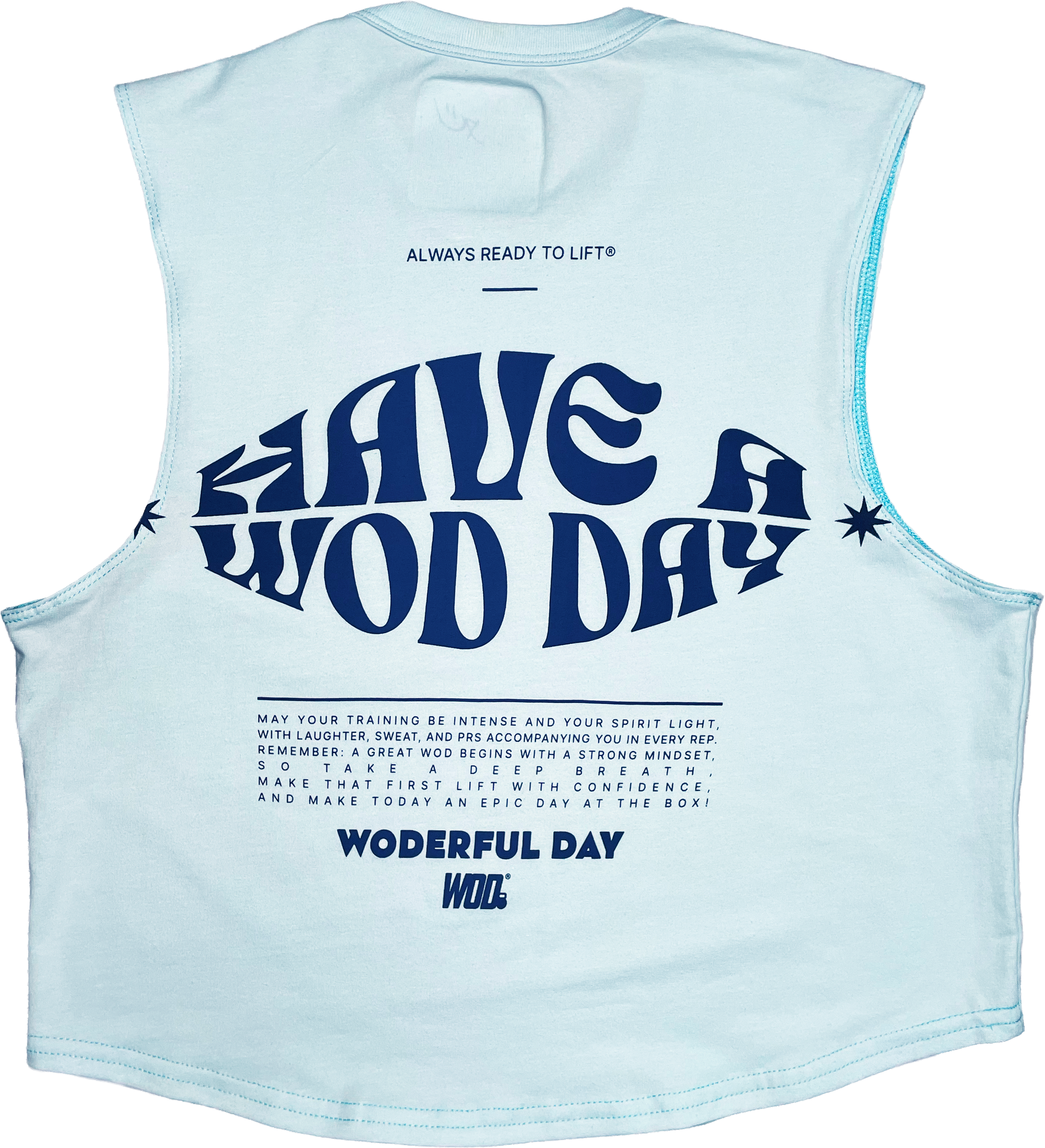 En el frente lleva el logo ALWAYS WOD, mientras que en la parte trasera aparece el mensaje positivo “HAVE A WOD DAY”, acompañado de un texto motivacional que celebra la intensidad, la confianza y la actitud en cada entrenamiento.